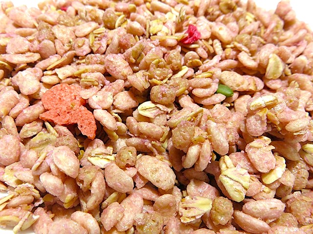 オーツ麦(オーストラリア又はフィンランド又はその他)、小麦粉、砂糖、ライ麦粉、米粉、デキストリン、植物油、コーンフラワー、水溶性食物繊維、ココナッツ、いちごピューレ、加糖練乳、かぼちゃの種、ラズベリー加工品、コーンスターチ、食塩、玄米粉、乾燥いちご、小麦ふすま、アーモンドミルク、乳糖/加工デンプン、香料、トレハロース、酸味料、ピロリン酸鉄、乳化剤(大豆由来)、セルロース、酸化防止剤(ビタミンE、チャ抽出物)、着色料(クチナシ、アントシアニン)、ナイアシン、クエン酸Na、パントテン酸Ca、ビタミンA、ビタミンB6、ビタミンB1、葉酸、ビタミンD、ビタミンB12。