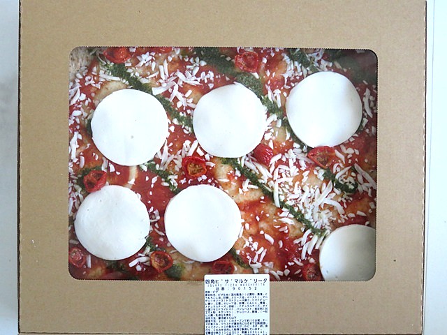 「四角ピザマルゲリータ」の原材料は、ピザ生地(国内製造)(小麦粉、食塩、とうもろこし油、砂糖、オリーブ油、イースト)、マルゲリータソース(トマトジュース漬け、トマトピューレ漬け、玉葱、オリーブ油、砂糖、にんにく、食塩、ナチュラルチーズ、胡椒)、ナチュラルチーズ、オイル漬けセミドライトマト、バジルペスト/安定剤(加工でん粉、キサンタン)、セルロース、酵素、(一部に小麦・乳成分を含む)。