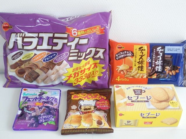 天乃屋、亀田、ナビスコ、ブルボン、ロッテ、グリコ、の6種類あり、1人1個という制約もなかったため、ナビスコとブルボンを買ってきました。