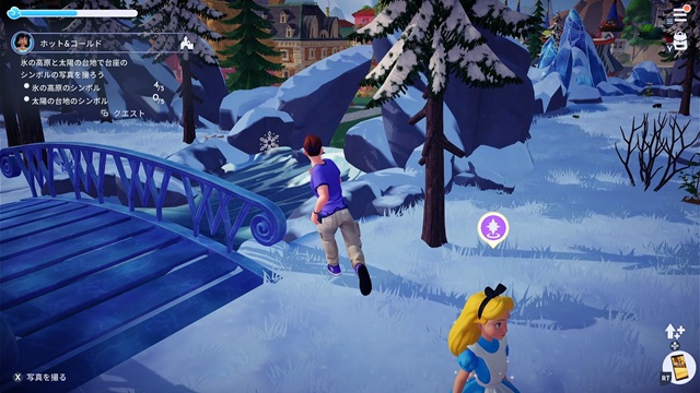 氷の高原と太陽の台地で台座のシンボルの写真を撮ります。「氷の高原のシンボル」は氷の結晶のマーク、「太陽の台地のシンボル」は太陽のマーク、がそれぞれ岩の横に白くくっきりと現れているため、見つけるのは難しくありません。「太陽の台地のシンボル」のうち2個は太陽の台地の北側の狭いエリアにあります。