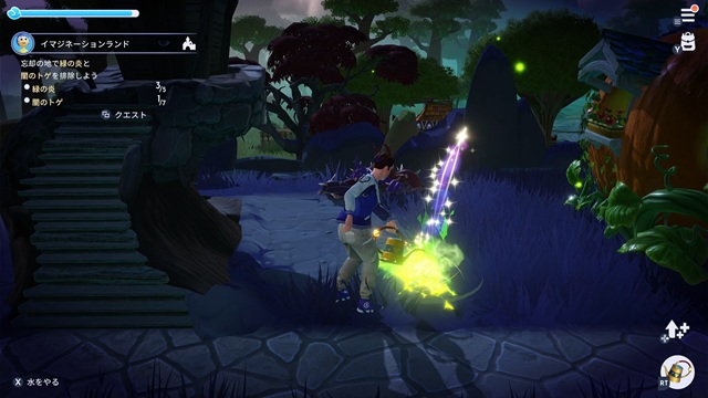ヨロコビに話しかけて「イマジネーションランドクエストを開始」を選び、「○○、こんにちは! バレーにある夢の製作スタジオのオープンセットを見ていたんだけど、その一部を飾り付け直すアイデアを思いついたの! 力を貸してくれない?」と聞かれたら、「面白そう! 話を聞かせて」と興味を示します。友情クエスト「イマジネーションランド」が始まります。