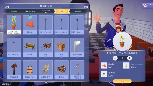 ヒマワリとデイジーの鉢植えの作成に必要な、「ヒマワリ」(0/10)と「デイジー(イエロー)」(0/20)を集め、作成ステーションで「植木鉢」(0/10)を作成します。
