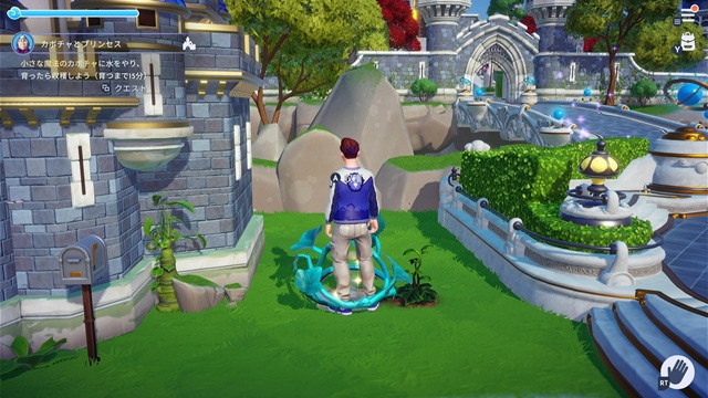 インベントリから「家具」を開き、「リクエスト」の「カボチャとプリンセス」と「魔法のカボチャ」を、プラザの願いの井戸の近くに配置します。