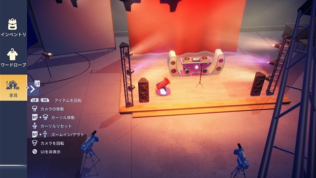 インベントリから「家具」を開いて左トリガーを引き、セットに右にあるポップミュージックのコンサートの家具を移動させます。移動させるのは、ステージライト×2、スピーカー×2、DJブース×1、紙吹雪の大砲×1、です。置き場所は、セット内ならどこでも構いません。