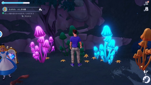 正しい組み合わせの光るキノコを灯します。灯すのは、1番目の紫のキノコと3番目の青いキノコです。