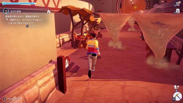 塵旋風を避けながら裏路地を進みます。塵旋風に接触すると直前の安全地帯まで戻されます。