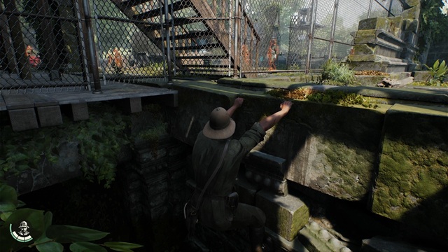 素早く階段を上がり、左の階段とはしごを上がり、隙間から建物内に入ります。ここから下に下りますが、下にいる2人のファシストに怪しまれることはありません。