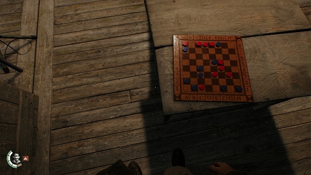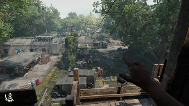 ボートが座礁しているところからキャンプの中に入り、今度は上に上がります。建物の外側を反時計回りに進み、キャンプ中側から扉を開けて室内に入ります。