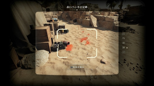 ナワルのテントを出てすぐに左に行き、石切り場の左手前で砂の上にある足跡を見つけ、「赤いペンキの足跡」の写真を撮ります。