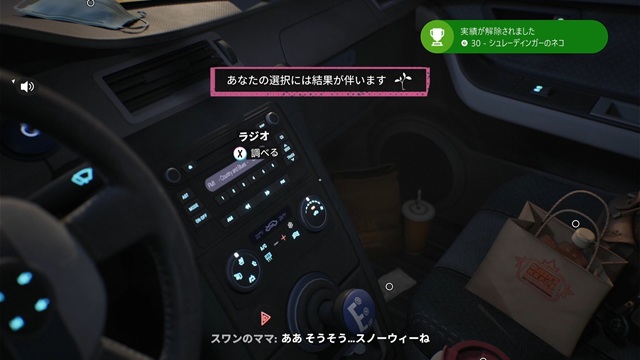 車中でスワンのママと電話中、選択肢を選んで会話します。方向パッドの上下かYボタンを押すことで選択肢を選び、Aボタンを押して決定します。どの選択肢も選ばない”沈黙”も選択肢のひとつになります。
