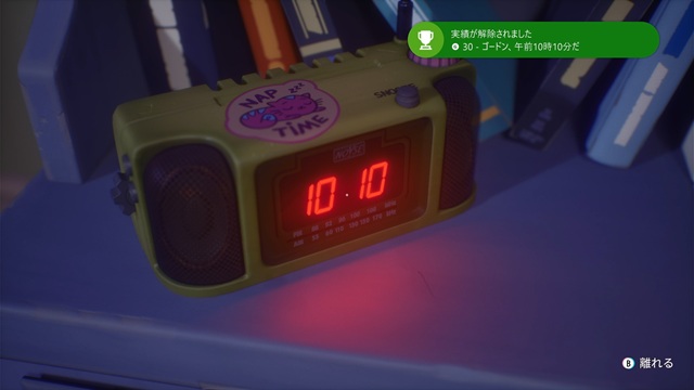 ただし、最初にベッドの奥の棚にある「目覚まし時計」を調べます。デジタルの時間が10:10になったら調べると、実績「ゴードン、午前10時10分だ」が解除されます。