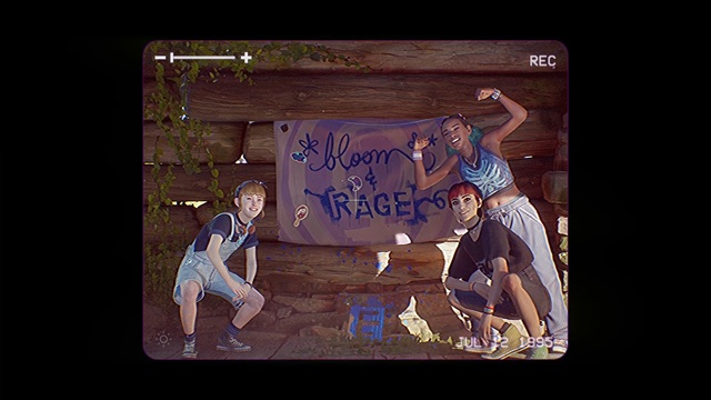 1995年の森の中の小屋に戻り、「開く」を選ぶとバナーが選んだ人のカラーになります。小屋の外に出ているので、「窓」を「思い出す」し、小屋の左から3人の後を追います。