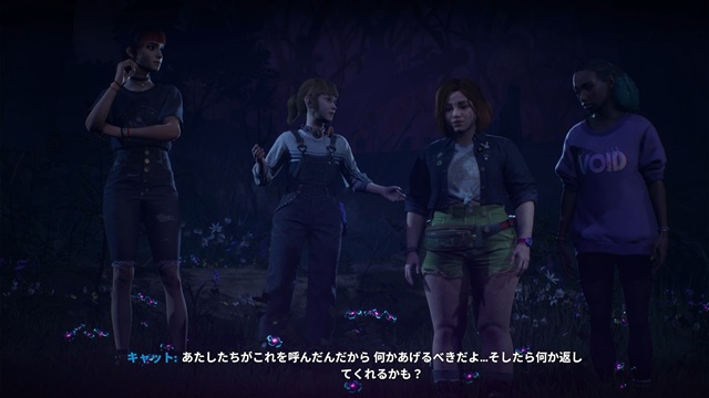 キャットの近くに行き、「いい映像が撮れたよ」、「パンデモニウム」、「ノーラ!?」または「オータム・・・?」、「あたしたちの血の儀式・・・うまくいったのかも」、「贈り物?」を選びます。