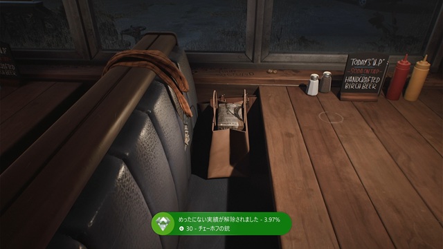 突き当たりの席に置かれた袋を覗き込みます。実績「チェーホフの銃」が解除されます。