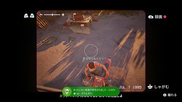 「給水塔(夕)」の斜め左下を見ると、バイクとビーチチェアのカップルがいるので、「(カップルのモノマネをする)」を選びます。実績「ダブ&ダバー」が解除されます。