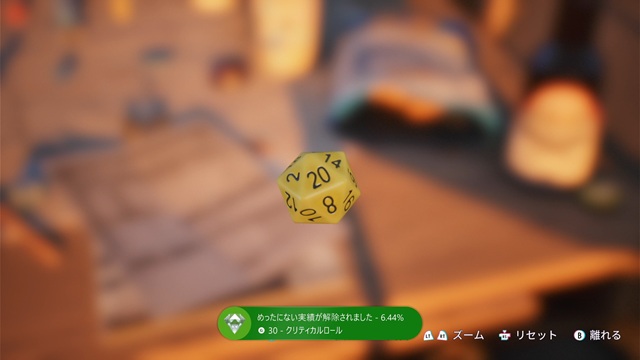 その横の「サイコロ」も「調べる」しますが、「サイコロを振る」は何度でも行えます。そこで、「20」が出るまで振り続けます。実績「クリティカルロール」が解除されます。