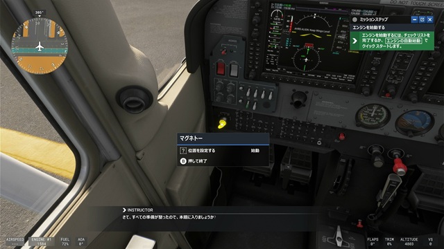 エンジンの始動は、「燃料セレクター」両方、「ミクスチャー」75%程度、「スロットル」100%、「オルタネーター」オン、「バッテリー」オン、「アビオニクスマスターバス1」オン、「アビオニクスマスターバス2」オン、「ビーコン灯」オン、「燃料ポンプ」オン、「マグネトー」始動、でも行えます。