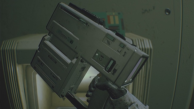 テーブルの上にある「C.A.T.」を拾ったら「C.A.T.オリエンテーション」を読み、右側のモニターで「ドアのアクセス」の「ドアを開く」をクリックして右にあるバッテリーを回収します。バッテリーは自動的に装填されます。