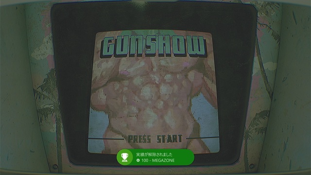 右奥に行って振り返るとアーケードゲーム「GUNSHOW」が稼働しているので、ボタンを押してプレイします。実績「MEGAZONE」が解除されます。
