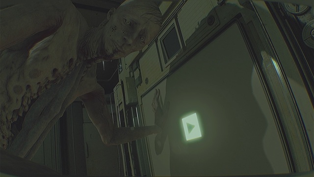 そのまま奥に進むとエンティティAに捕まってしまいます。しかし、ボタンを連打すると逃げることができます。狭い通路にいるので振り返って奥に進み、突き当たりを右に曲がります。