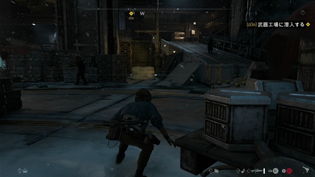 貨物リフトが動き出して止まったら、砂のマウンドがあるところで物陰に隠れます。敵を倒して奥の階段を下り、ドアを開けて通路に入り、通路の反対側にいる敵を一掃します。