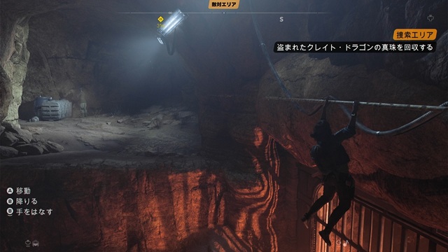 突き当たりでスピーダーを下りて壁を上がり、古代生物の巣に入ったら奥の洞窟に向かいます。