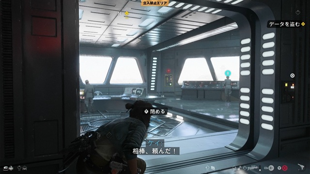 階段を下りて上がって反対側に行き、建物横のバーとパネルを使って上に上がります。双眼鏡を見ているストームトルーパーを倒して左にいる帝国軍技師も倒し、ドアを開けて中に入ります。