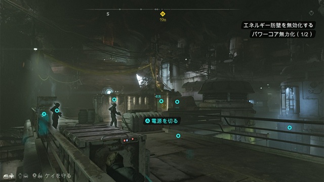 奥にパイク2人がいるのでその手前まで行き、ニックスに斜め右にある電源を切らせます。