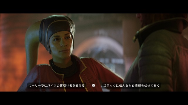 クリムゾン・ドーンのウーリーラが現れるので、「ウーリーラにパイクの裏切り者を教える」か「ゴラックに伝えるための情報を伏せておく」か選びます。選んだ方の評判が良好になります。