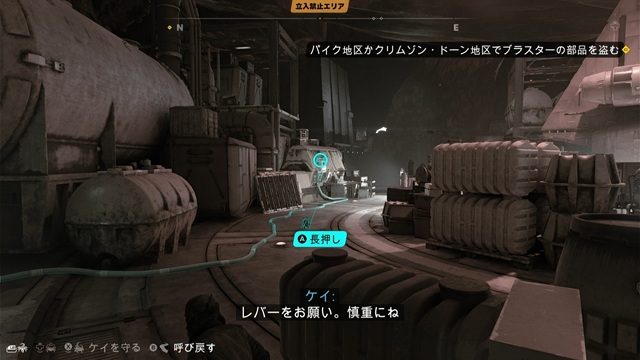クリムゾン・ドーンに注意しながらレバーの左に行き、大きなファンの前で隠れます。ニックスにAボタン長押しでレバーを下げる指示をし、大きなファンが止まったらすぐにくぐり抜けます。
