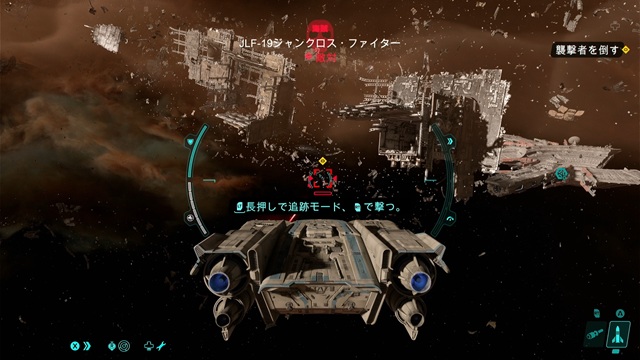 海賊が現れるので倒します。LBボタンかRBボタンを押して敵の攻撃を回避し、左トリガーを長押しして追跡モードに入り、右トリガーを引いて撃ちます。