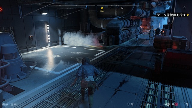 ドアを通り抜けてハシゴを上がり、反対側のゲートを「データ・スパイク」を使って開けます。中に入って物陰に隠れ、ストームトルーパー2人を倒します。