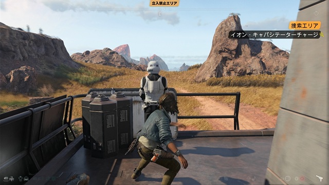 目的地の南側に行き、右側の壁を3段上がって施設の横に行きます。施設には、帝国軍技師3人とストームトルーパー2人がいます。