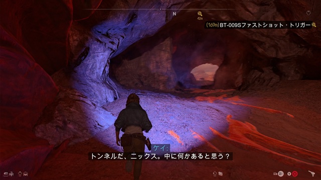 向かい側にある岩山に行き、右にある小道に入ります。突き当たりから下に飛び下りて奥に進み、明るいところには出ないで右のくぼみにホロディスクを挿入します。